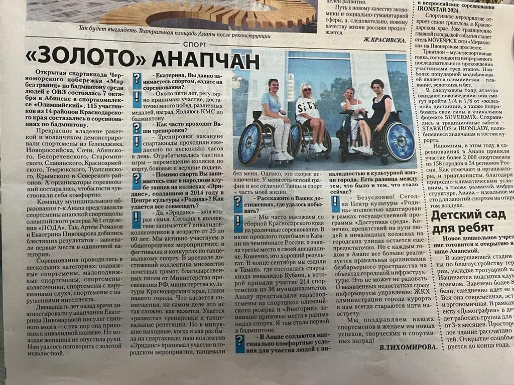 7 октября 2023 года в городе Абинске прошла открытая Спартакиада Черноморского побережья "Мир без границ" по бадминтону среди людей с ОВЗ. В соревнованиях приняли участие спортсмены из 12 районов Краснодарского края, 115 человек. Команду Анапы представили Артем Романов и Екатерина Пивоварова.